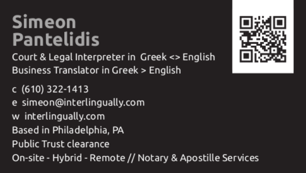 I seek to provide to the utmost a considered and workable solution for each of my customers and clients. My services include Greek < > English interpreting with experience including judicial, medical, and liaison settings throughout the United States and abroad, and Greek < > English translation with experience in legal translations, including but not limited to judicial proceedings, official certificates, financial correspondence, apostille services, and law enforcement translations.